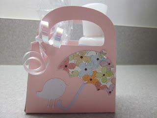 I'm putting together a small baby shower for a friend at work and am very excited about the little favors I made for the guests. I used  my sisters "Tags, Bags, Boxes and More" cartridge to make the gift bags. The umbrella is from Create-a-Critter and the bird is from "Straight from the Nest". THe bags were a bit of a pain to put together, but now that they are all done I love them!
